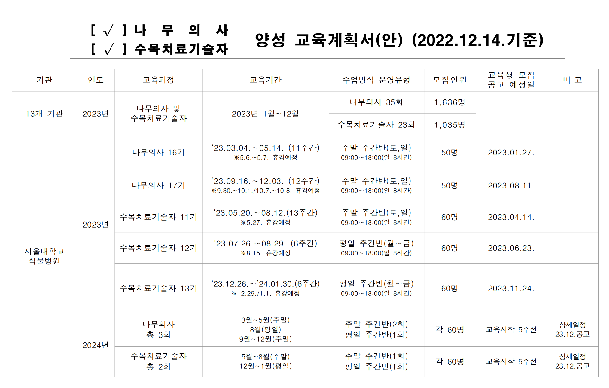 2023년도 서울대학교 식물병원 양성교육과정 운영계획 ※ 코로나19 상황에 따라 대면/비대면 유동적으로 운영합니다. 바로가기 2023년도 나무의사 자격시험 시행계획 및 출제범위 나무의사 – 공
