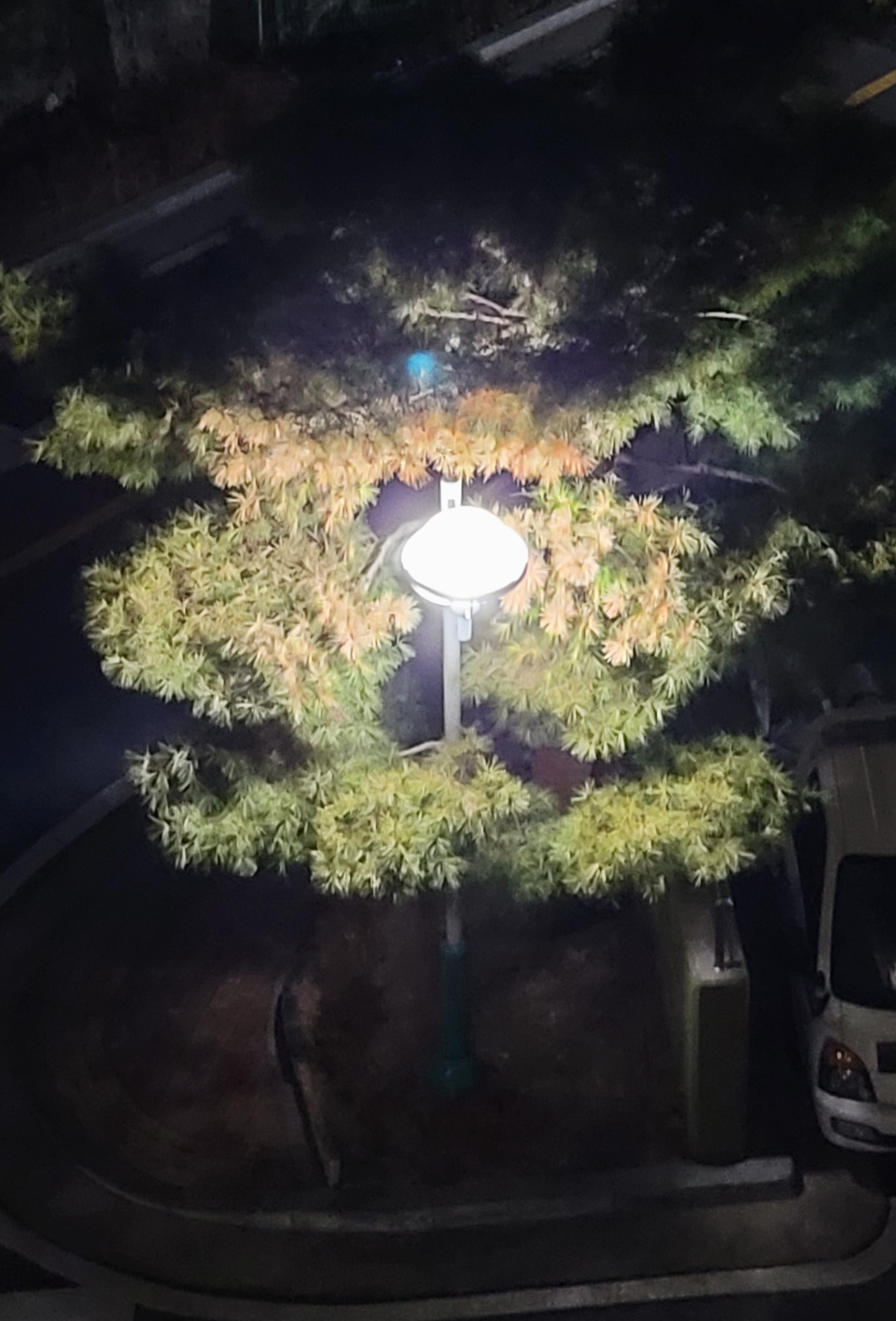 아래 사진은 밤에 조명이 들어온 사진으로 상록수인 소나무 곁에 붙어 있는 가로등이 환하게 빛을 밝히고있다. 하지만 나무에 가린 빛은 가로등의 역할도 부족해보인다.
