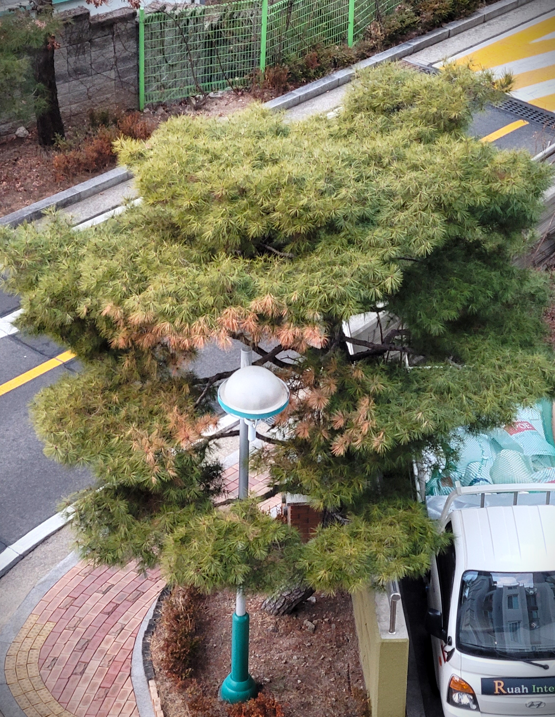 좀 더 확대 해 보면 가로등 주위 소나무 잎들로 열이 전달되어 피해를 보고 있는 듯 하다. 특히 기온이 서서히 오르면서 피해가 눈에 띄기 시작한 것으로 판단된다. 아마도 가로등이 LED는 아닌가 보다. 혹, LED라고 하더라도 생리적인 피해가 있어 저렇게 나무와 붙어 있는 것은 부적절해 보인다.