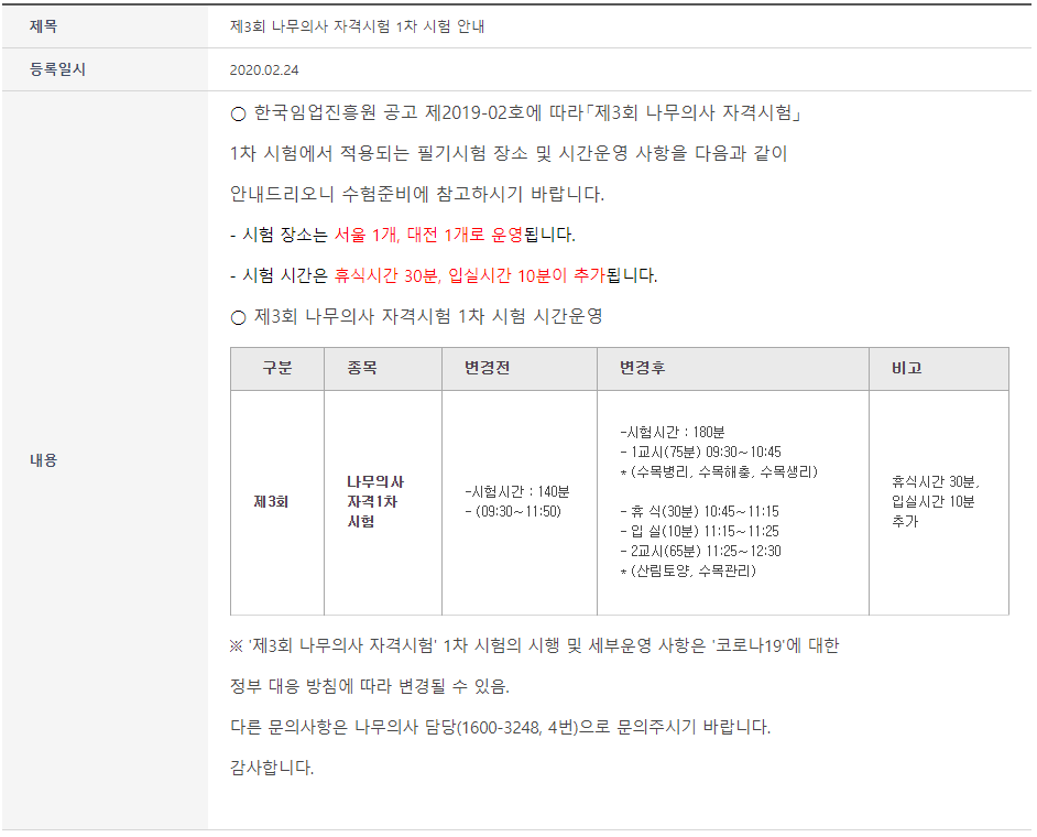 나무의사 3회 필기시험 시간조정.
